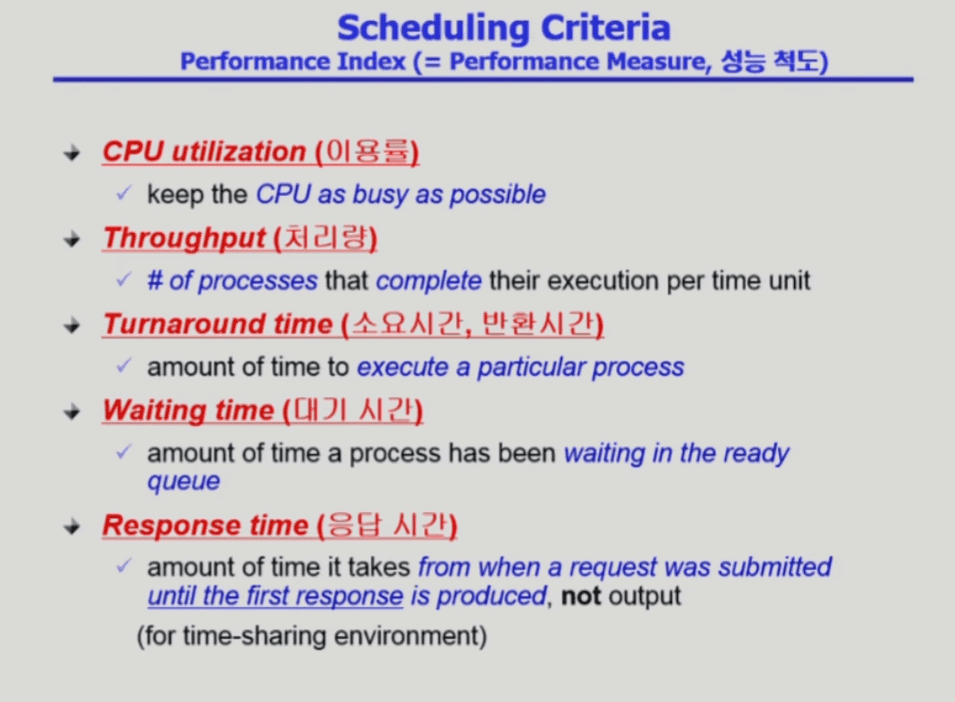 짧은 시간에 많은 처리량으로 CPU가 놀지 않고 많은 일을 하는 것(CPU 이용률)이 좋은 것