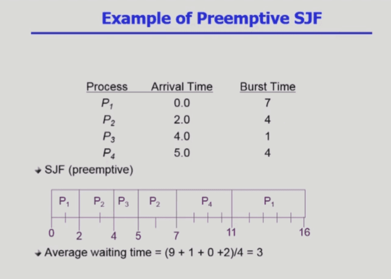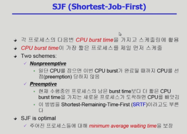 preemptive한 방법 : CPU를 잡고 있는 프로세스의 남은 Burst time보다 더 짧은 CPU burst time을 가진 프로세스가 들어오면 CPU를 빼앗김 (SRTF라고도 부름)