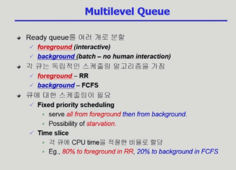 Ready Queue를 여러 개로 분할하고, 각 큐가 우선순위가 있음