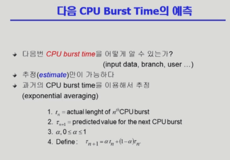 n + 1번째 CPU Burst를 예측한다면, (n + 1번째 CPU Burst Time 추정) = α * (실제 n번째 CPU Burst Time) + (1 - α) * (n번째 CPU Burst Time 추정치)로 α를 이용해 가중치를 줌