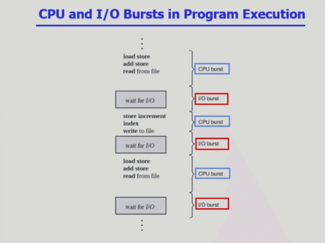 I/O가 빈번하게 끼어들지 않는 프로그램은 CPU 버스트가 길 것이고, 사람과 인터렉션이 많은 프로그램은 I/O 버스트가 길어지고 상대적으로 CPU 버스트가 짧아질 것임