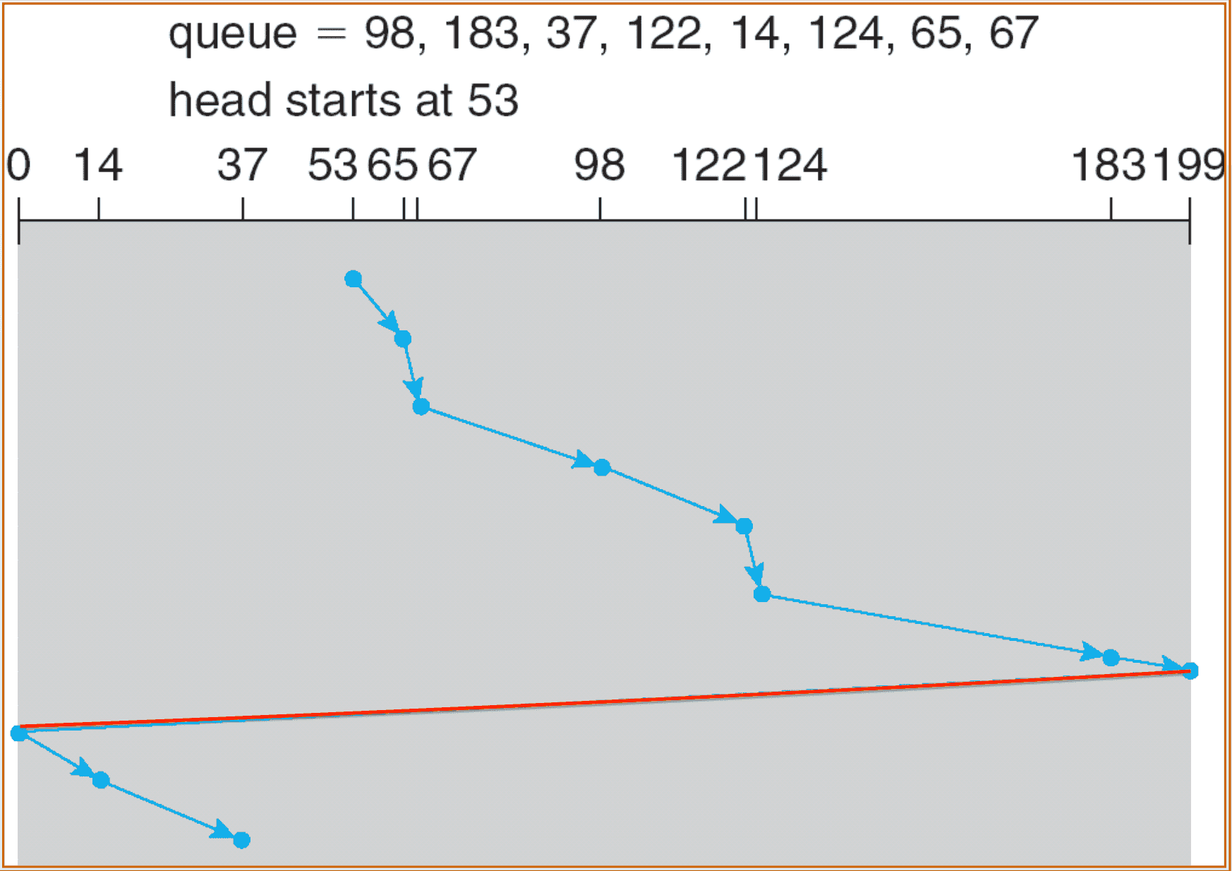 SCAN과 유사하지만, 한 방향으로만 이동하며 끝에 도달하면 다시 시작점으로 .