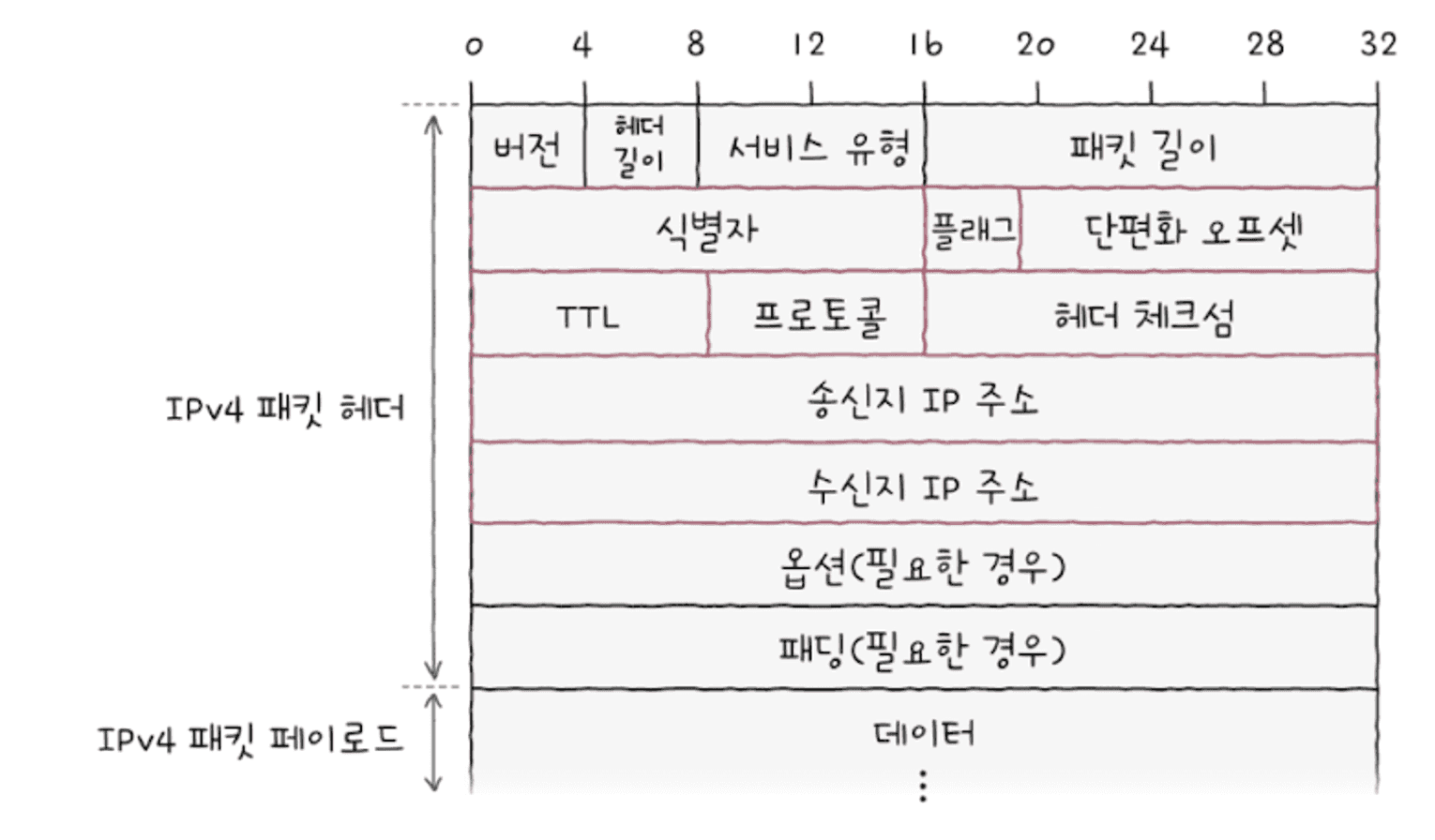 IPv4는 다음과 같이 구성됩니다. 식별자(Identifier)는 패킷에 할당된 번호입니다. 만약 메시지 전송 과정에서 패킷이 쪼개어졌다면 수신지에서 다시 조합하기 위해 식별자를 사용합니다. 플래그(Flag)는 총 세 개의 비트로 구성된 필드로 첫번째 비트는 항상 0이며 사용되지 않습니다. 두번째 비트와 세번째 비트는 각각 DF(Don’t Fragment), MF(More Fragment)라는 이름이 붙은 비트입니다. DF가 1로 설정되어 있다면 단편화를 수행하지 않고 0이라면 IP 단편화가 가능합니다. MF가 0이라면 이 패킷이 마지막 패킷임을 나타내며, 1이라면 아직 뒤에 패킷이 더 있다는 의미입니다. 단편화 오프셋(Fragment Offset)은 패킷이 단편화되기 전에 패킷의 초기 데이터에서 몇 번째로 떨어진 패킷인지를 나타냅니다.