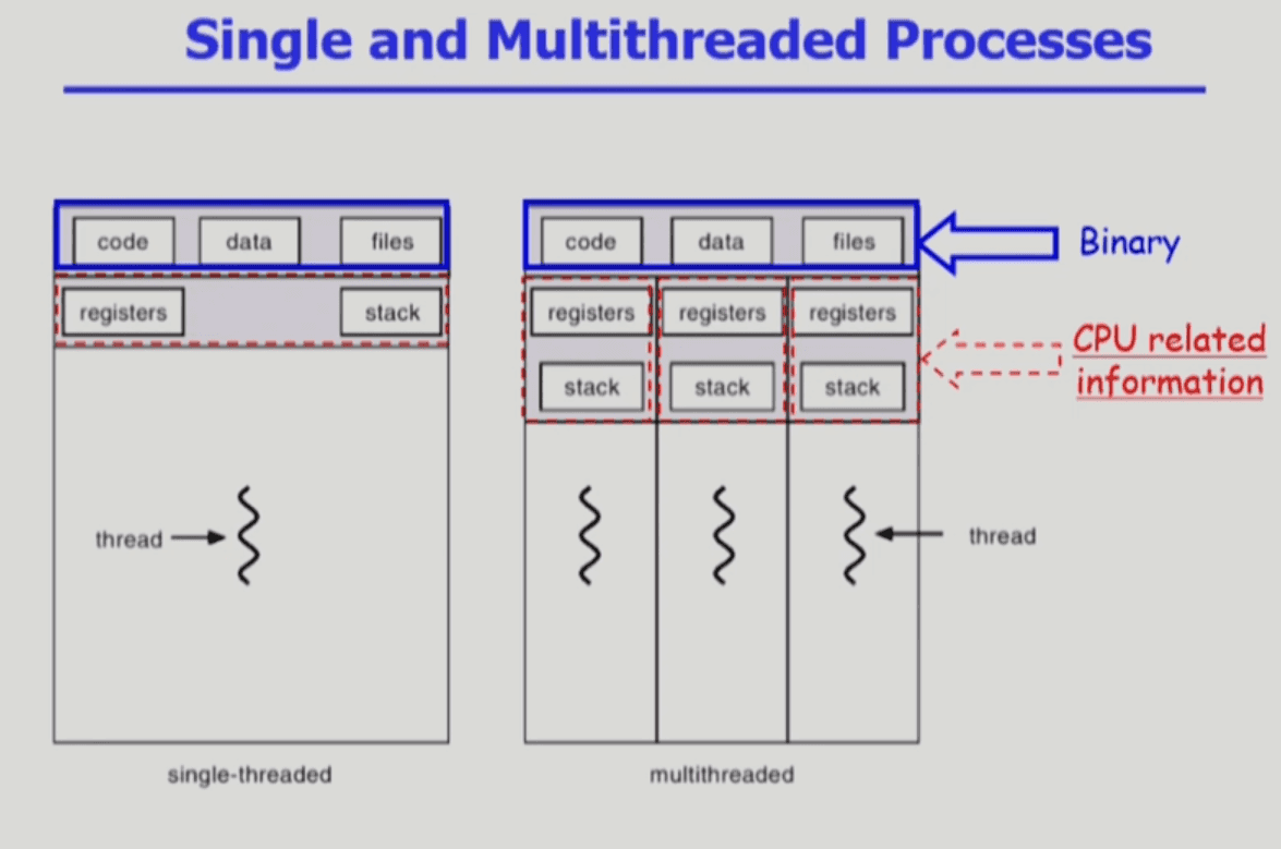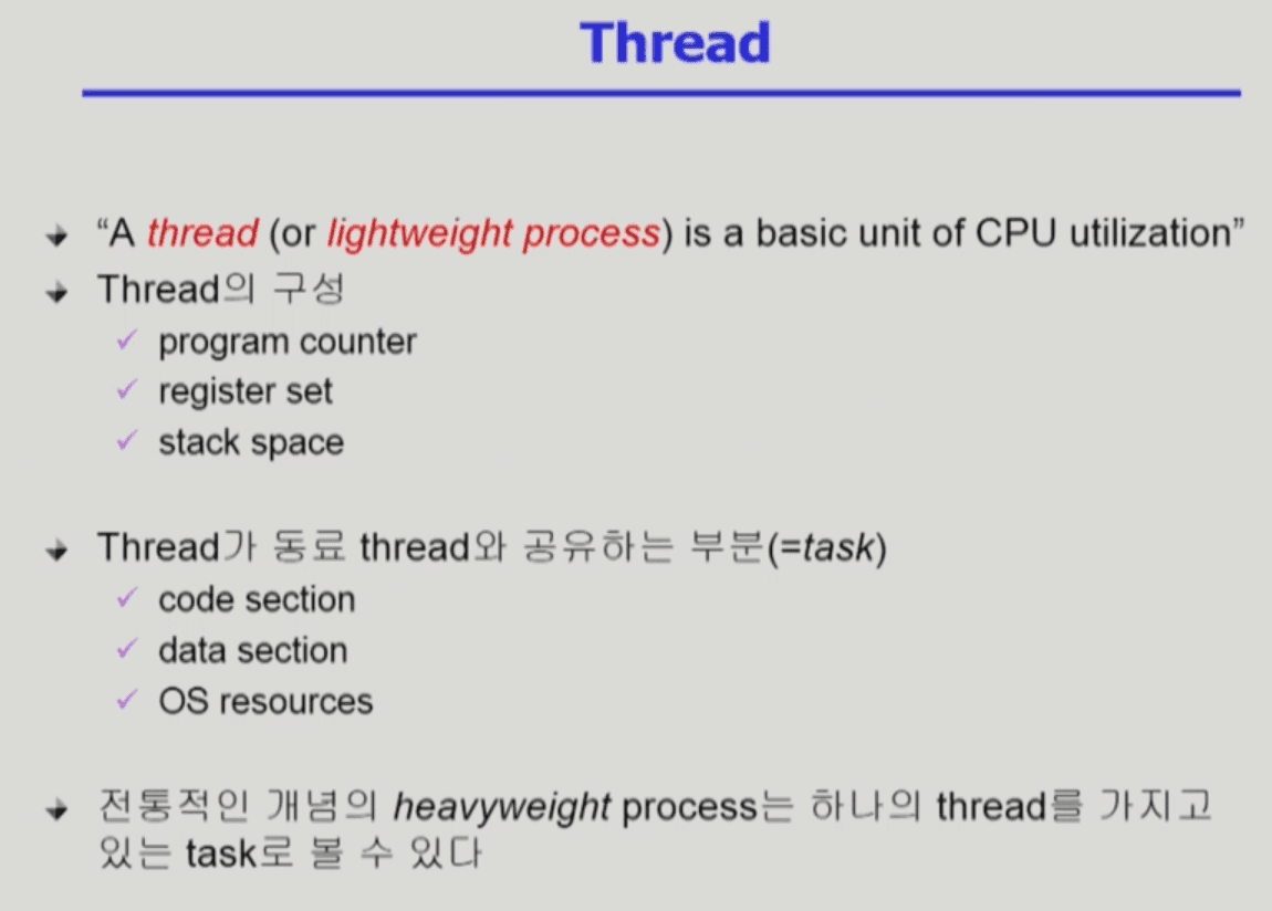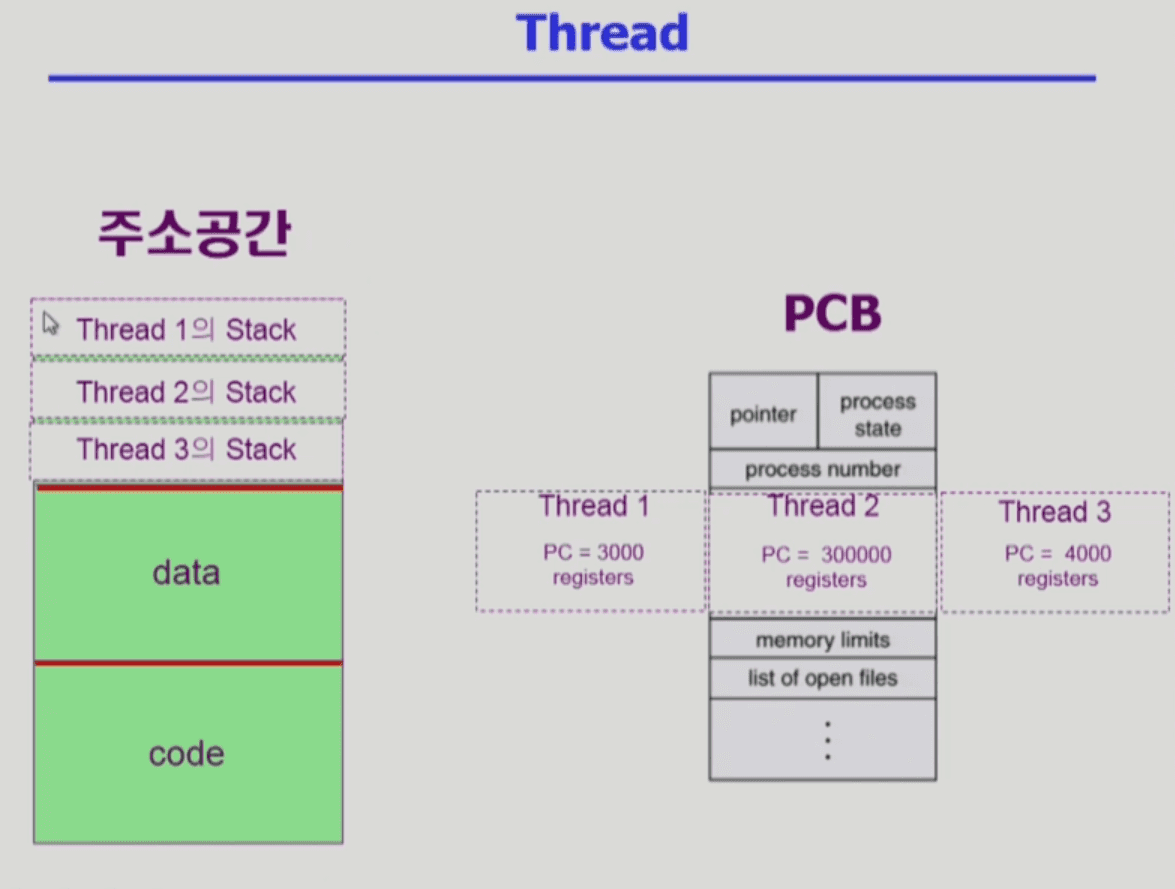 - ◦근데 프로세스 안에 스레드를 하나 만드는 건 작은 것만 추가하면 되기 때문에 오버헤드가 크지 않음