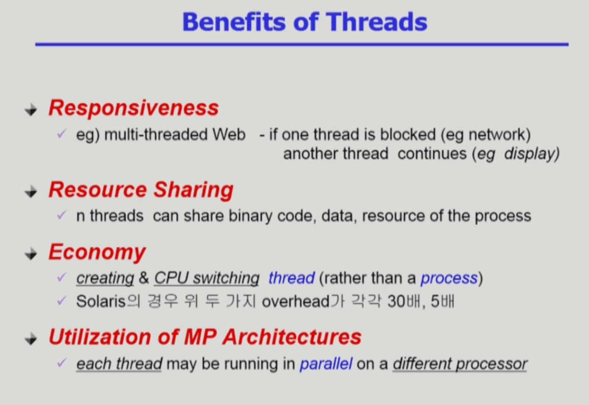 - ◦Unix의 일종인 Solaris운영체제의 경우 프로세스 생성은 30배가 들고, 컨텍스트 스위칭은 5배가 더 든다.