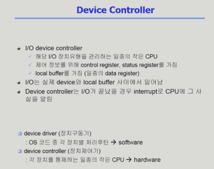 Device Controller: 각 장치를 통제하는 일종의 작은 CPU로 하드웨어임