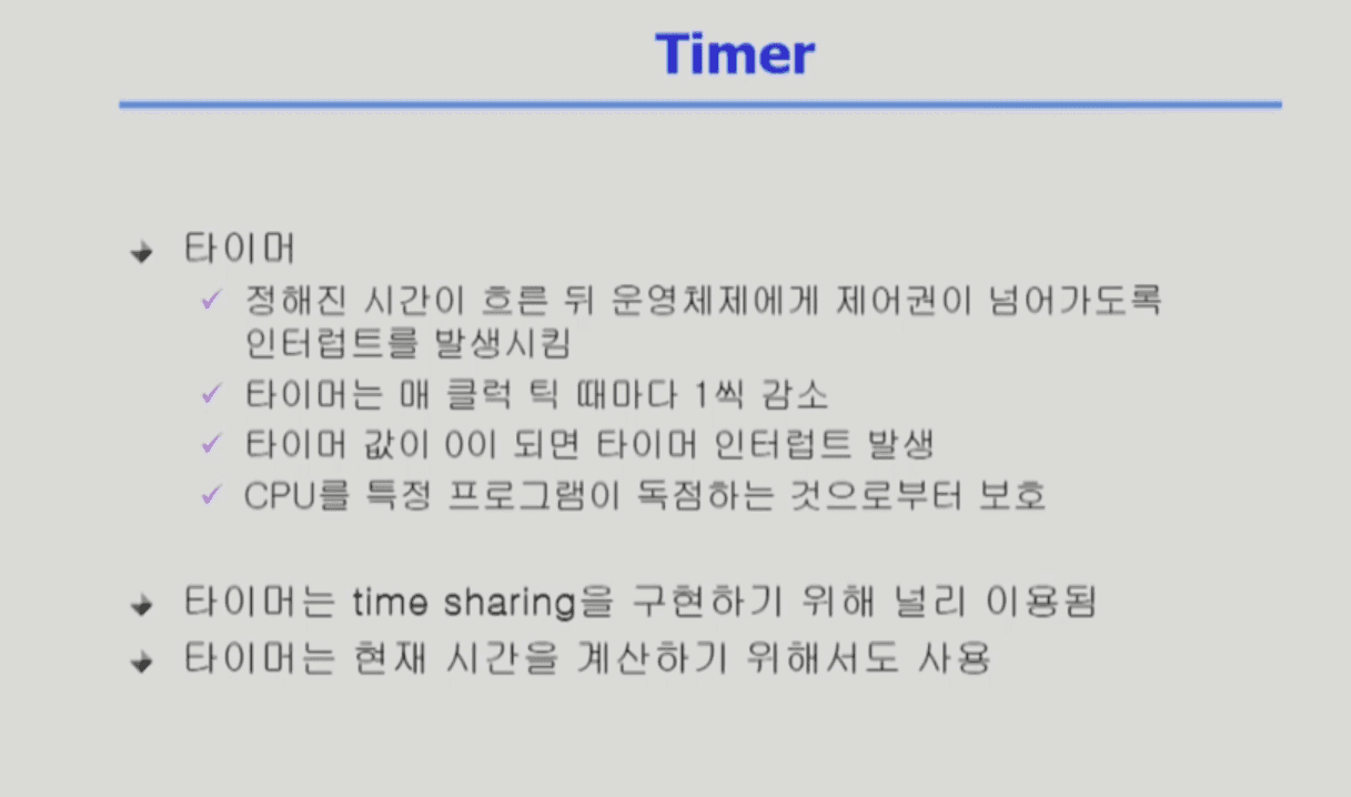 처음에는 OS가 CPU자원을 가지고 있다가 사용자 프로그램이 실행되면 OS가 Timer에 수십ms정도 특정 값을 세팅한 뒤에 사용자 프로그램에 CPU를 넘겨준다.