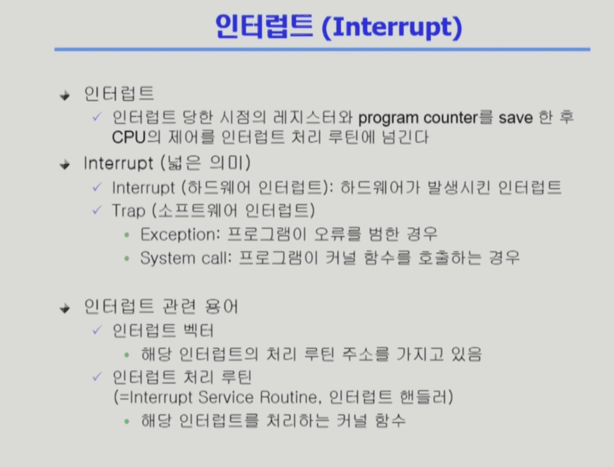 인터럽트 처리 루틴(Interrupt Service Routine) : 운영체제를 만들 때 어떤 인터럽트는 어떤 루틴을 수행해야 하는지 정의가 되어 있는데, 그 때 실제 코드를 인터럽트 처리 루틴이라고 함