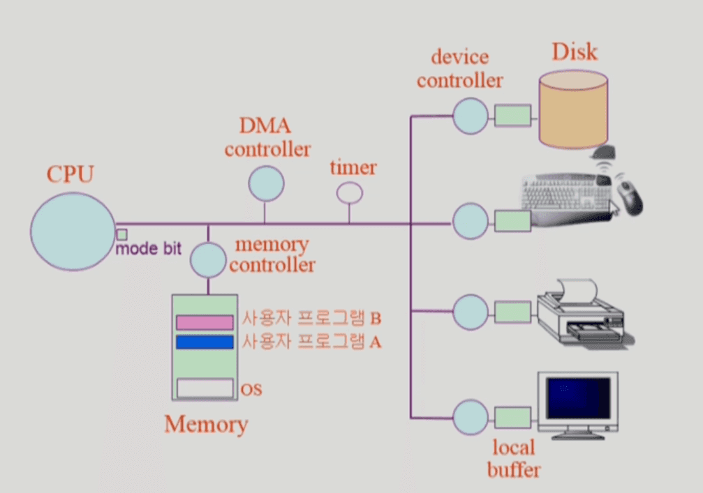각각의 디바이스를 통제하는 것은 CPU의 역할이 아니라 각각에 붙어있는 Device Controller의 역할임 / 작은 CPU와 같은 역할을 함