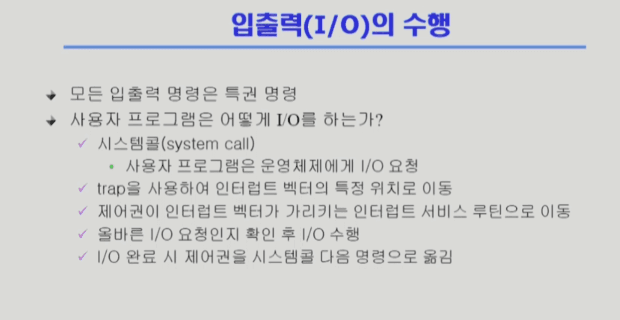 사용자 프로그램은 직접 I/O를 하지 못하고 OS에게 요청해서 해야 함