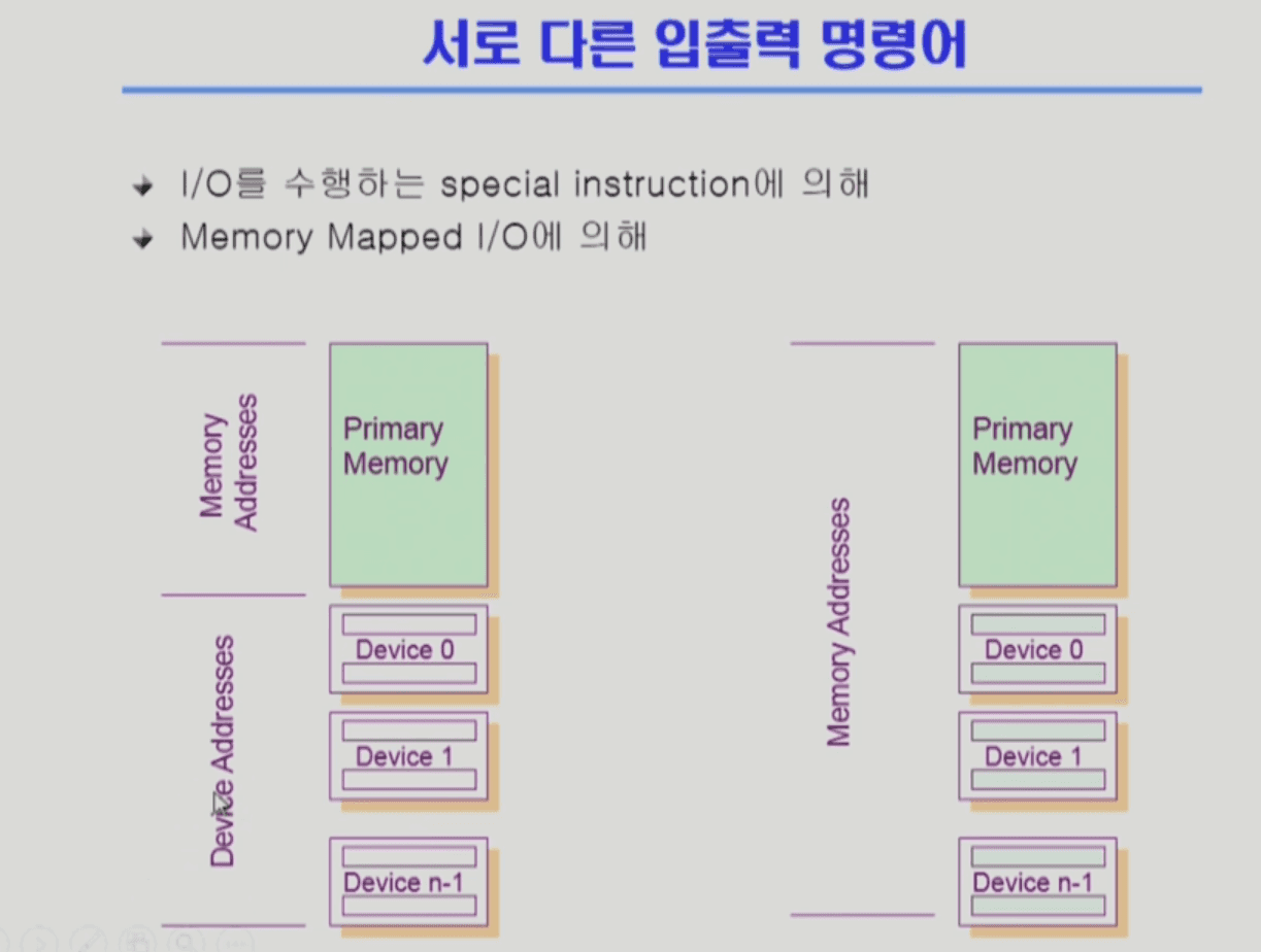 방식2 : Memory Address 중 일부를 Device에 할당해 Memory Address를 통해 I/O장치에 접근하는 방식 (Memory Mapped I/O)
