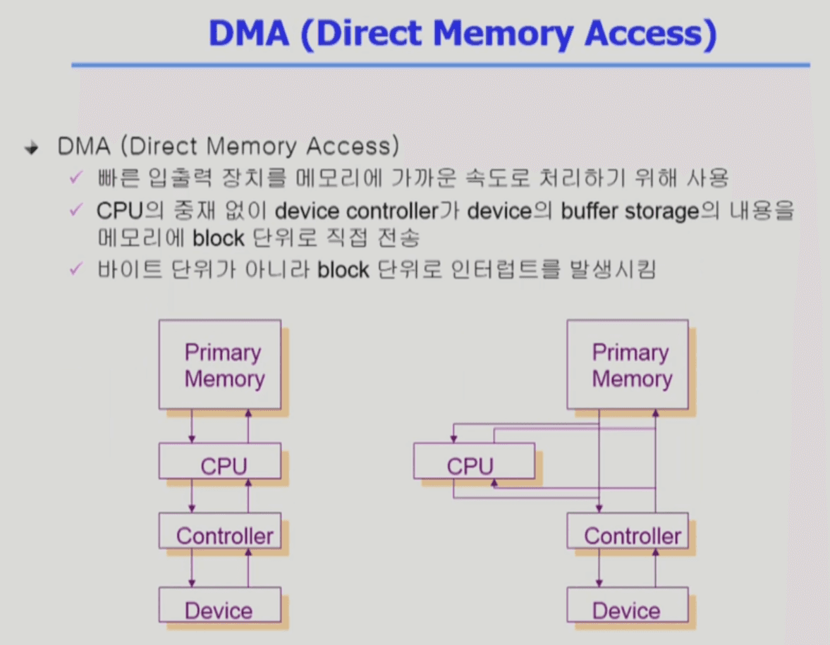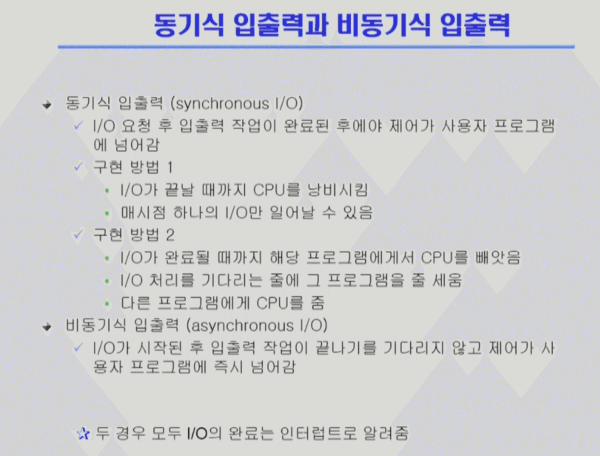비동기식 입출력 : I/O를 요청한 후에 작업이 끝나기를 기다리지 않고 제어가 사용자 프로그램에 즉시 넘어가는 것