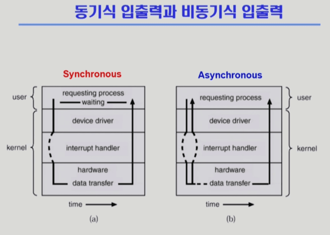 동기식 입출력 : I/O를 요청한 후에 I/O 장치로부터 작업이 완료된 후에야 사용자 프로그램이 다른 일을 할 수 있는 것